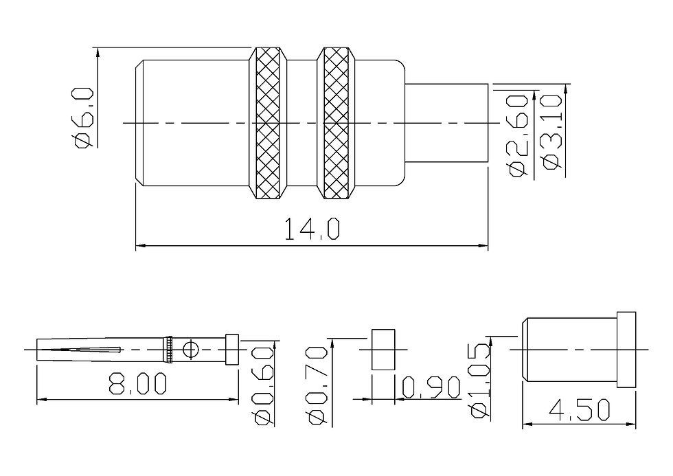MCX連接器使用卡扣式接口,通常具有50歐姆的阻抗(有些為75歐姆)。 它們提供從DC到6 GHz的寬帶功能。 接觸表面鍍金。插頭的外徑約為3.6毫米或0.140英寸。